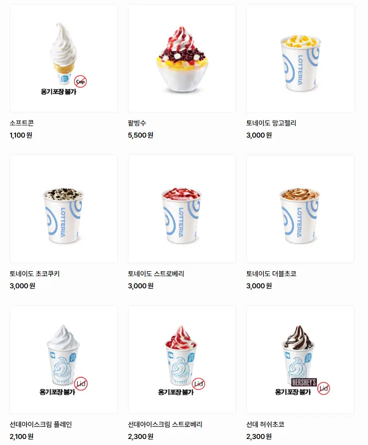식사 후 달콤한 맛을 원하는 고객들을 위해 롯데리아는 다양한 디저트 메뉴도 제공하고 있습니다. 아이스크림, 선데이 등이 대표적입니다.