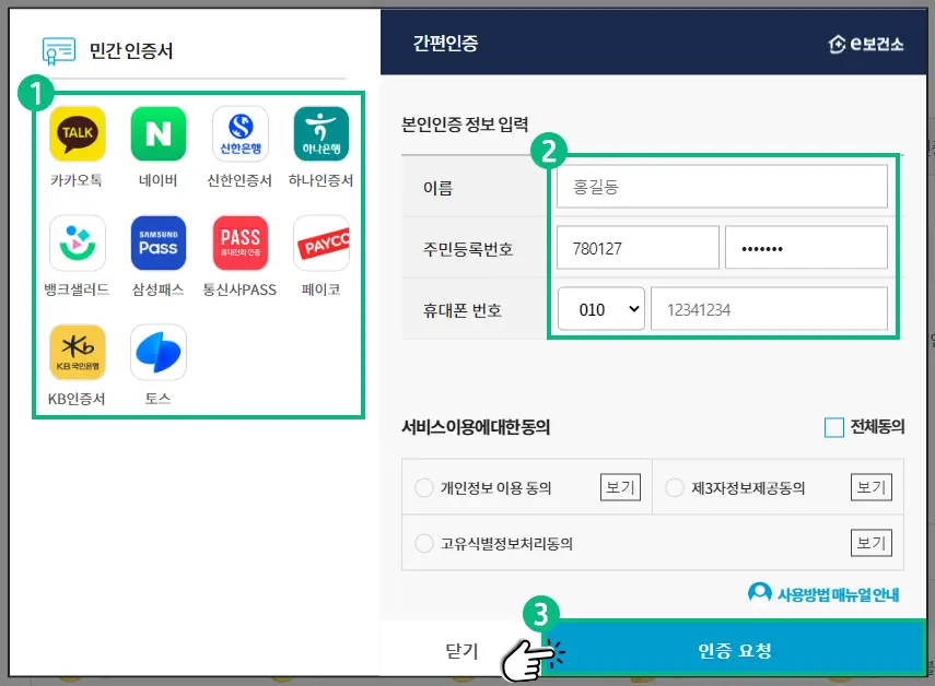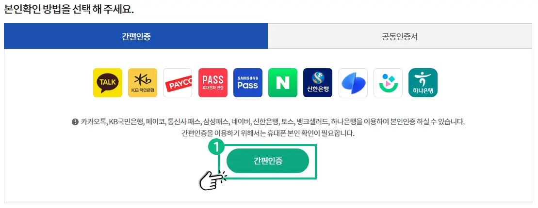 - 간편 인증/공동인증서 중 본인인증(간편 인증 추천!)