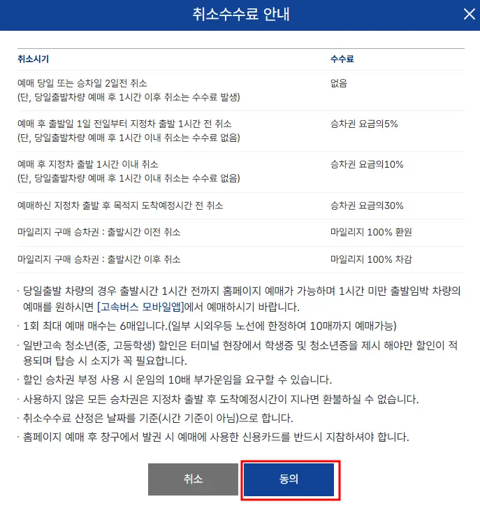 - 취소수수료 안내를 확인하고 '동의'를 클릭합니다.
