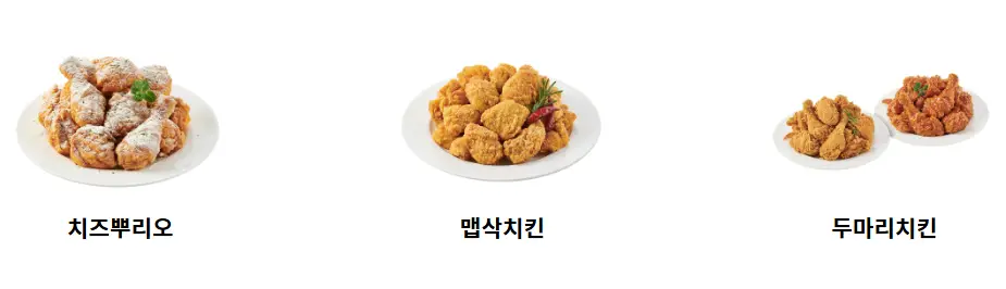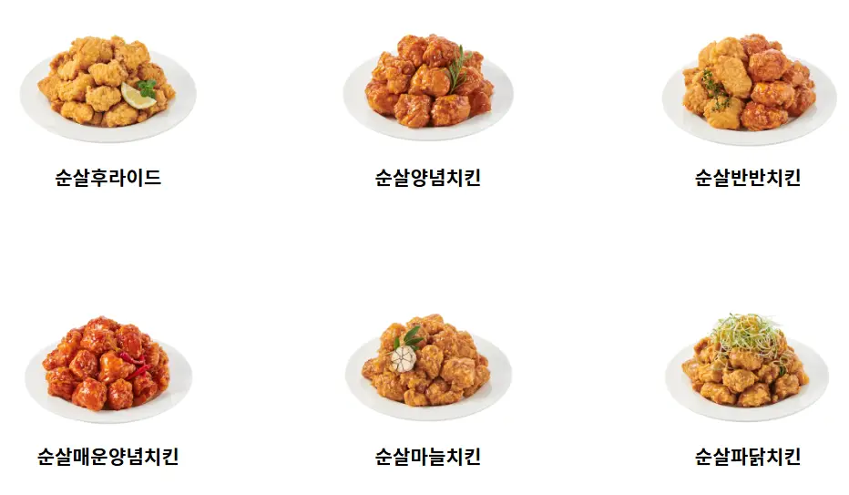 | 순살치킨 | 뼈 없는 부드러운 고기로 고기 본연의 맛을 즐길 수 있습니다. | 뼈를 싫어하는 분들에게 아주 좋고 간편하게 먹을 수 있습니다. |
