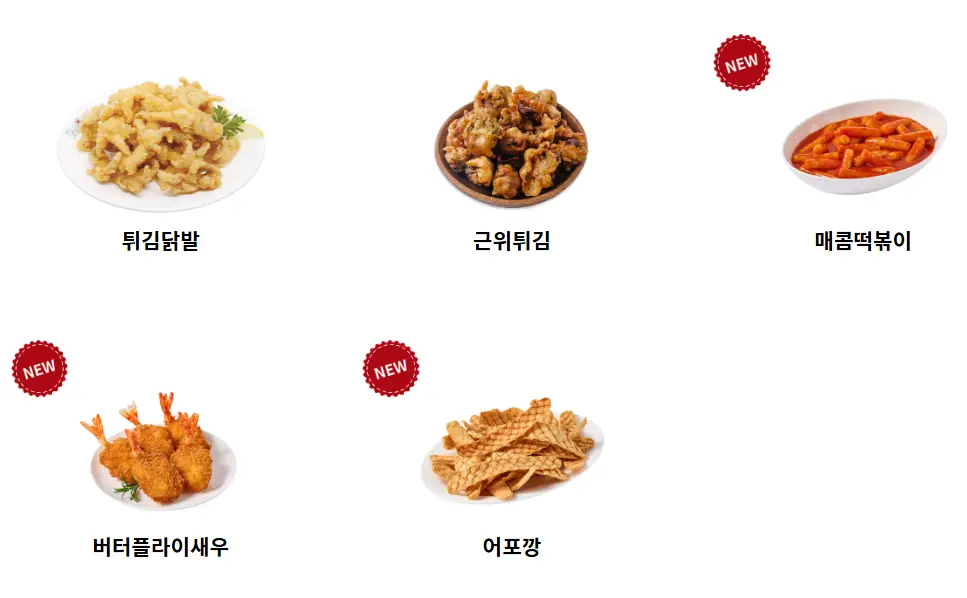 | 후라이드 치킨 | 바삭한 겉과 촉촉한 속 | 치킨 소스, 매운 소스 |
