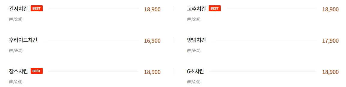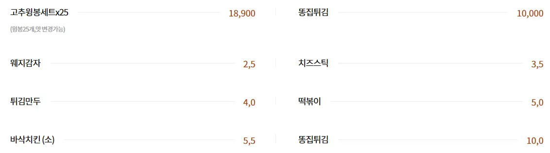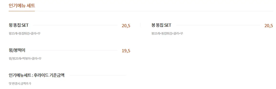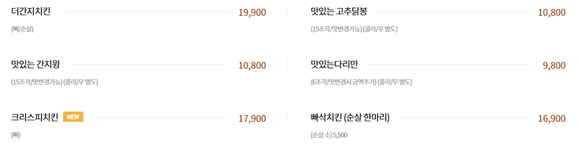 | 소스 | - 핫소스: 신선한 고추를 사용하여 매운 맛을 극대화합니다.- 간장 소스: 간장과 마늘, 생강을 조화롭게 섞어 깊은 맛을 냅니다.- 허니 버터 소스: 버터와 꿀을 이용해 달콤하면서도 고소한 맛을 자랑합니다. |