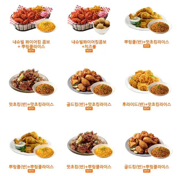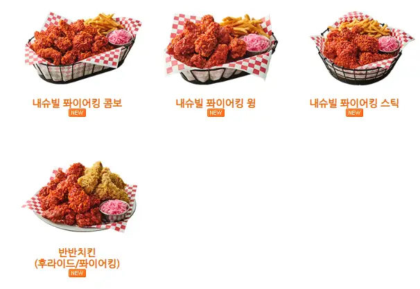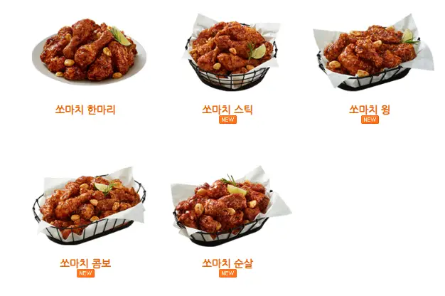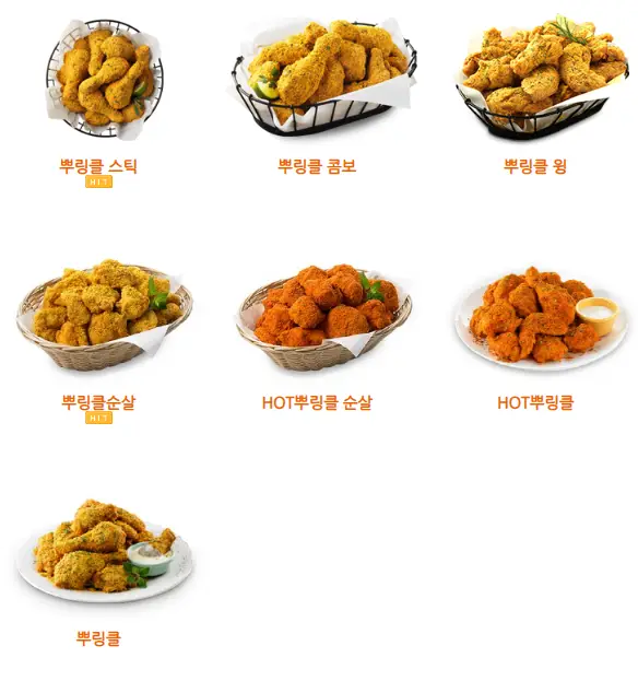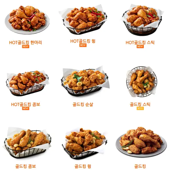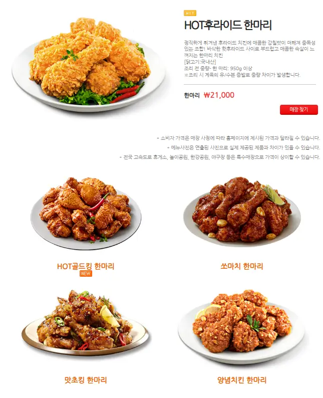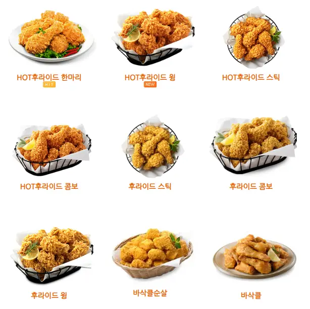 - 후라이드 한 마리: 바삭함과 육즙을 즐길 수 있는 기본적인 프라이드치킨입니다. 아무리 다양한 맛이 있어도 기본 맛이 매우 중요합니다.